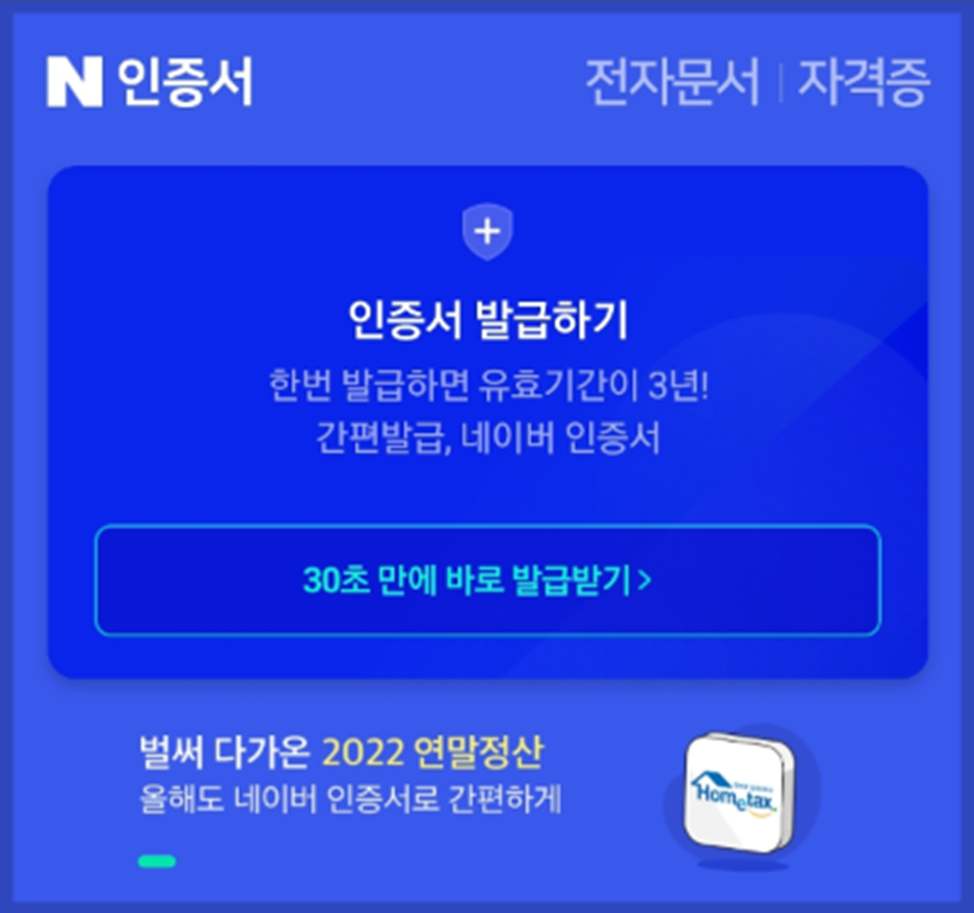 네이버 검색창에서 "공동인증서 발급"을 검색하면 인증서 발급 페이지가 나타납니다. 네이버 로그인 후 발급 버튼을 클릭하면 공동인증서를 발급할 수 있습니다.